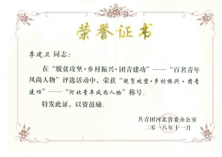 李建衛同志是全國農村青年致富帶頭人、河北省標準化聯盟副會長、2017河北物流杰出人物、河北省現代物流協會副會長、京津冀冷鏈物流區域標準制定專家組專家成員、河北省農產品市場協會專家咨詢委員會專家、河北省農村青年拔尖人才,2016年4月榮獲邢臺市五一勞動獎章。