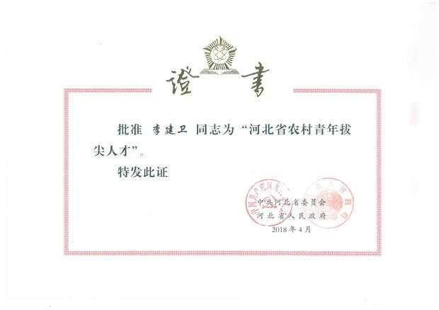 根據省委、省政府《關于實施農村青年人才開發工程的意見》的文件精神,經過嚴格的申報推薦、資格審查,通過綜合評審,我集團副總經理李建衛同志作為新型市場主體經營者的優秀代表被評為河北省第三批農村青年拔尖人才。