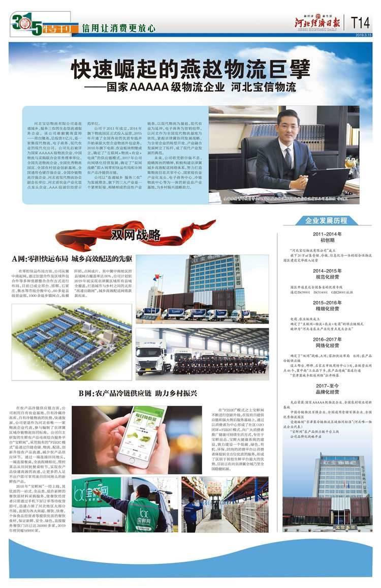 2019年3月15日(ri)(ri),在全國消費者(zhe)權益日(ri)(ri)這個特殊的日(ri)(ri)子里,寶信物流被河北經濟日報整版報道,成為京津冀區(qu)域誠信物流品(pin)牌的(de)典范。