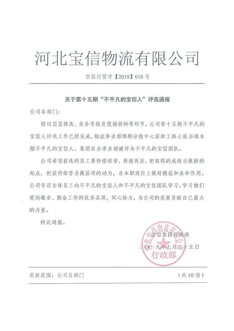 2019年7月25日,在寶信集團總部,進行了不平凡的寶信人現場答辯,經過層層篩選,業務考核及現場答辯等環節,公司第十五期不平凡的寶信人評選工作已經完成,物流事業部邯鄲分撥中心裝卸工韓士航當選本期不平凡的寶信人,集團農業事業部被評為不平凡的寶信團隊。各位候選人表現也很棒,公司為他們準備了獎品,望全體員工向不平凡的寶信人學習。