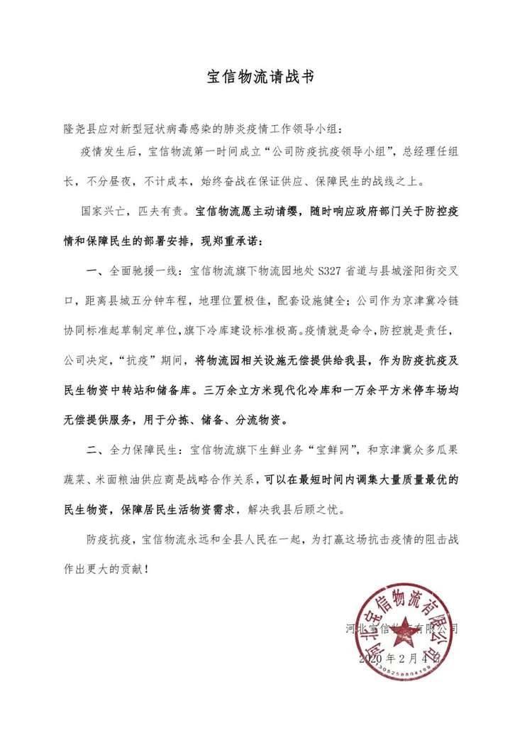 疫情當前,寶信物流全員備戰,與全國人民一起,齊心協力,共克時艱。2月4日,公司向抗疫主管部門提交了請戰書,將公司旗下物流園區的相關設施無償提供給隆堯縣,作為防疫抗疫及民生物資中轉站和儲備庫。主動請纓,誓做物流先鋒。