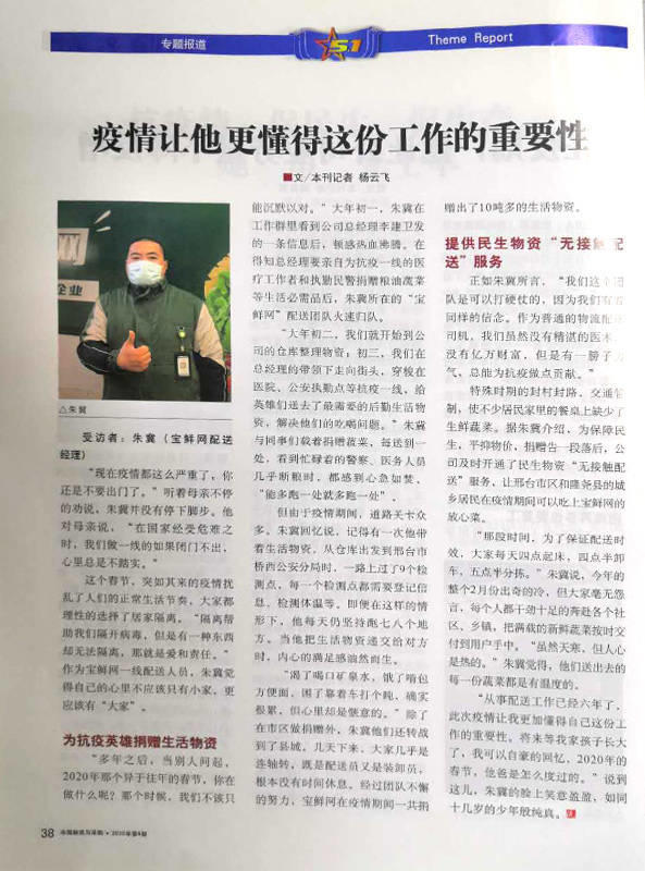 該雜志2020年第9期對寶信物流抗疫事跡進行了專題報道、表彰,尤其對公司旗下“寶鮮網”配送團隊在疫情期間“舍小家,為大家”始終堅守在保障民生的戰線上的無私奉獻精神,給予了高度贊揚。寶信物流在疫情中向抗疫一線機構及人員捐贈生鮮蔬菜、優質面粉、大米、健康食用油以及各類水果近50噸,并承擔起了隆堯縣城鄉居民和邢臺市區居民的糧油蔬菜供應配送任務,有效的減少了零散外出的購買行為,減小了交叉感染的幾率,讓百姓在疫情期間能夠吃上放心菜、安全菜。公司也被認定為“全國疫情防控重點保障企業”(河北省唯一一家物流公司)。