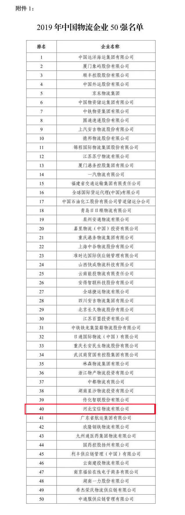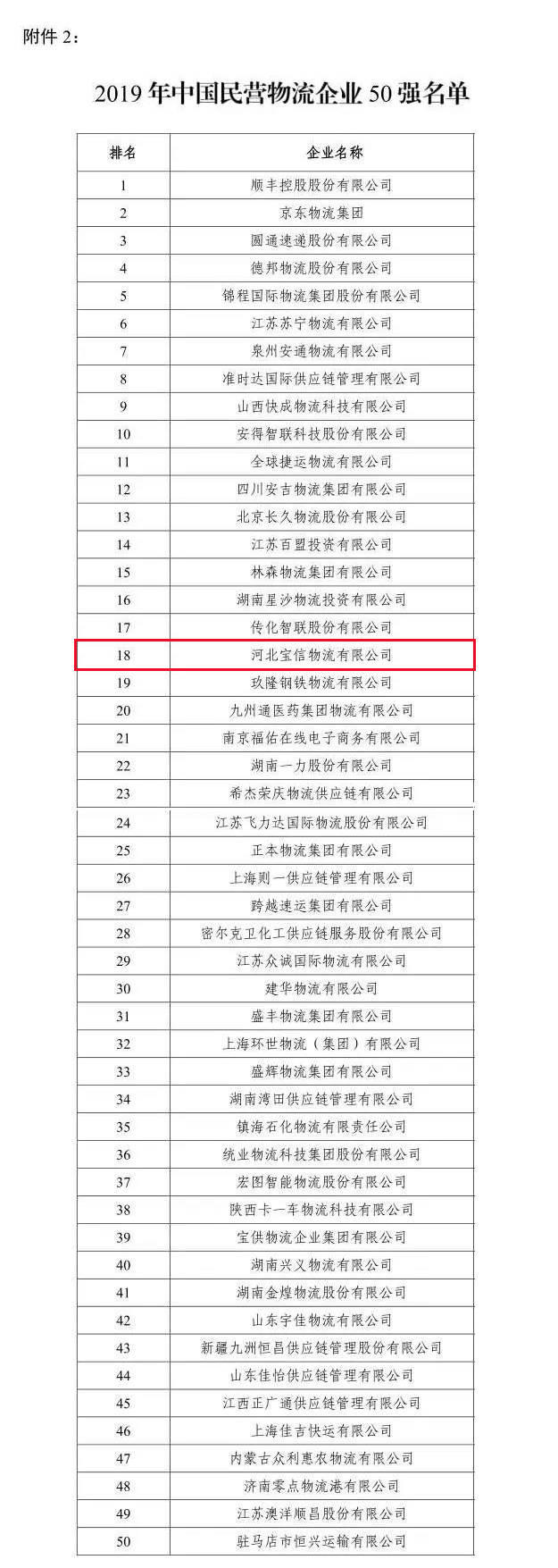 根據國家發展改革委、中國物流與采購聯合會《國家發展改革委關于進一步加強社會物流統計工作的通知》的要求,中國物流與采購聯合會實施了重點物流企業統計調查,根據調查結果公布了《關于2019年度中國物流企業50強和民營物流企業50強排名的通告》(物聯科字﹝2020﹞50號),寶信物流強勢入圍,獲評中國物流企業第40名和中國民營物流企業第18名。