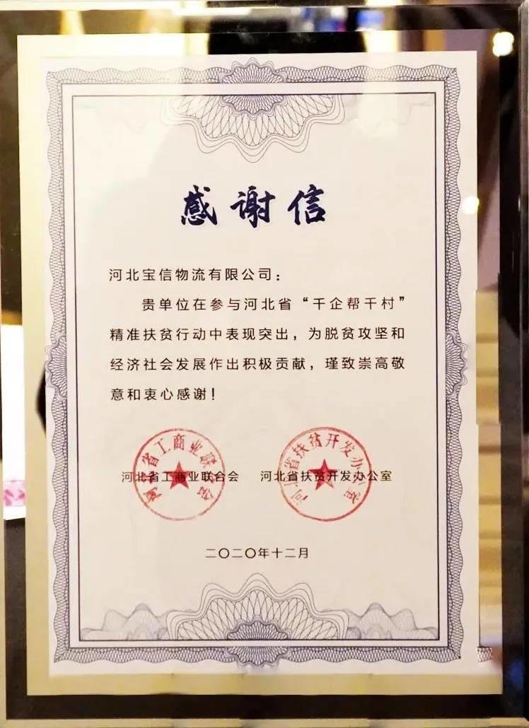 會上對全省參與“千企幫千村”精準扶貧行動的先進民營企業(商會)進行通報表彰,經層層推薦、嚴格篩選,河北省“千企幫千村” 精準扶貧行動領導小組決定,授予河北寶信物流有限公司為省“千企幫千村”精準扶貧行動先進民營企業。寶信物流公司總經理李建衛受邀參會,并在會議現場收到了來自河北省扶貧開發辦公室和河北省工商業聯合會的感謝信。