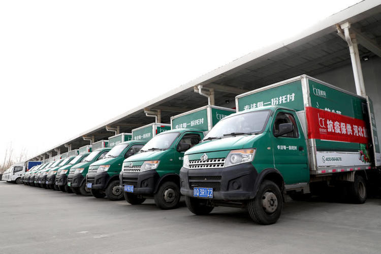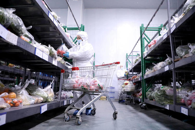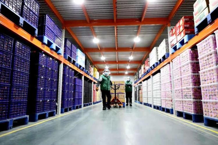 2021年1月12日(ri),河北寶信物流有限公(gong)司的員工將分(fen)揀(jian)打包(bao)好的蔬菜(cai)用手推車運到(dao)相應地區(qu)的貨(huo)架上。